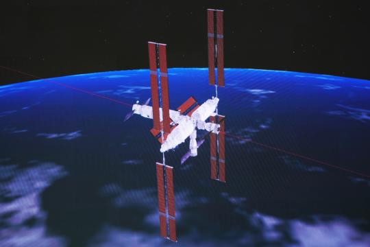 Imagem simulada capturada no Centro de Lan?amento de Satélites de Jiuquan, em 30 de novembro de 2022, mostra a nave espacial tripulada Shenzhou XV da China conduzindo um acoplamento automatizado com a combina??o da esta??o espacial Tiangong. (Foto: Xinhua)