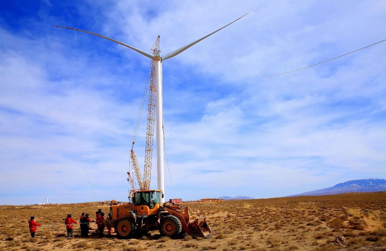 Um equipe de técnicos está instalando turbinas eólicas no parque eólico de 30 quilowatts em Pingshanhu, distrito de Ganzhou, cidade de Zhangye, província de Gansu, em 10 de fevereiro de 2023. (Foto: Yang Yongwei/Diário do Povo Online)