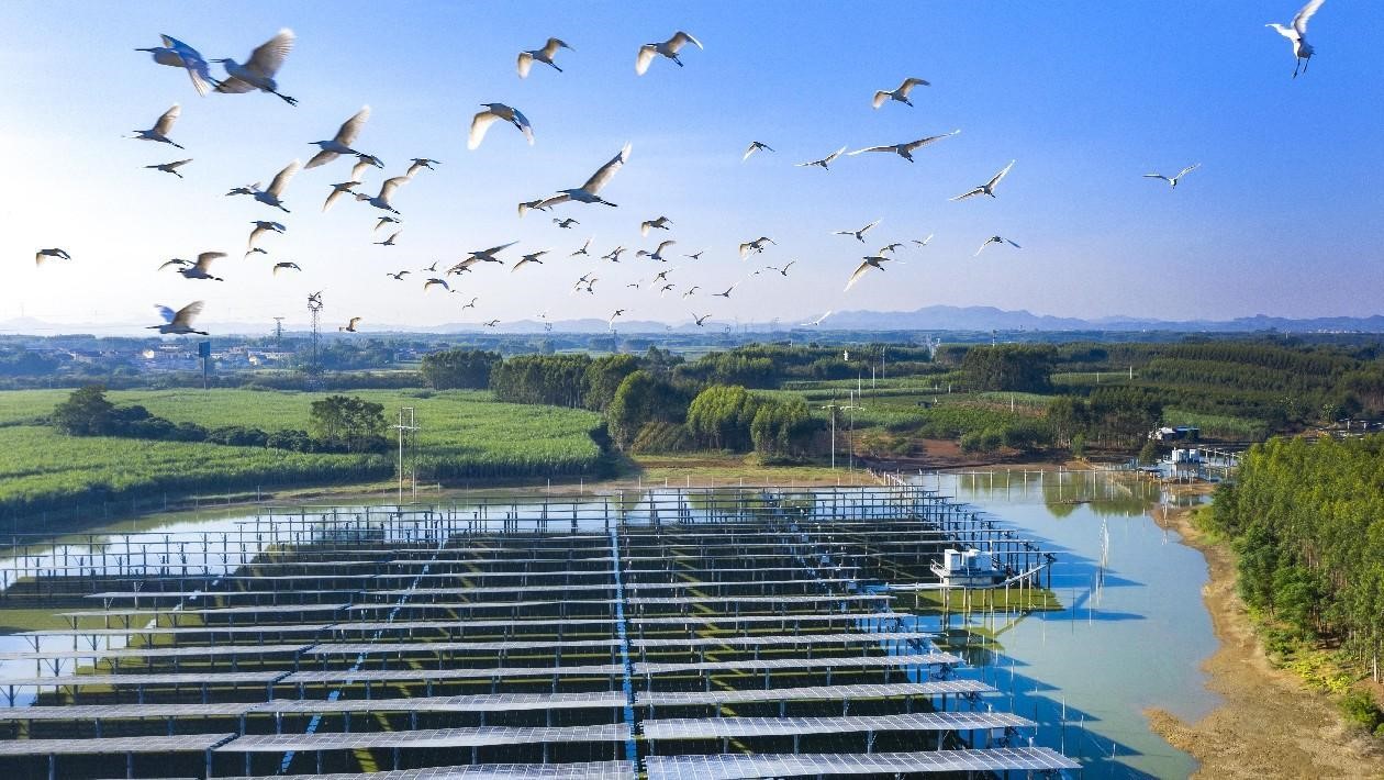 A vista aérea de uma esta??o de energia fotovoltaica na vila de Xinsheng, distrito de Binyang, Regi?o Aut?noma da Etnia Zhuang de Guangxi. (Foto: Zeng Xiangzhong/Diário do Povo Online)