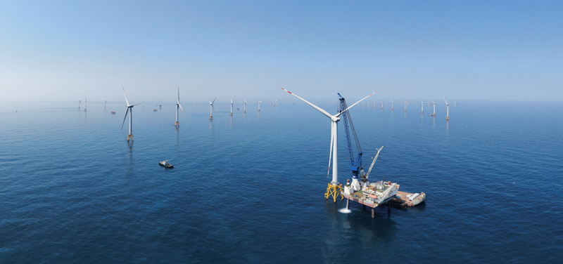 Uma plataforma de engenharia, operada por engenheiros da estatal China Railway Group Limited, constrói uma turbina eólica offshore na área offshore de Changle, província de Fujian. [Foto: China Daily]