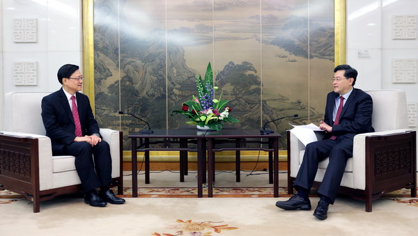 O conselheiro de Estado e ministro das Rela??es Exteriores da China, Qin Gang, reuniu-se na quinta-feira com John Lee, chefe do Executivo da Regi?o Administrativa Especial de Hong Kong (RAEHK), em Beijing, para trocar opini?es sobre o trabalho diplomático relacionado à regi?o.