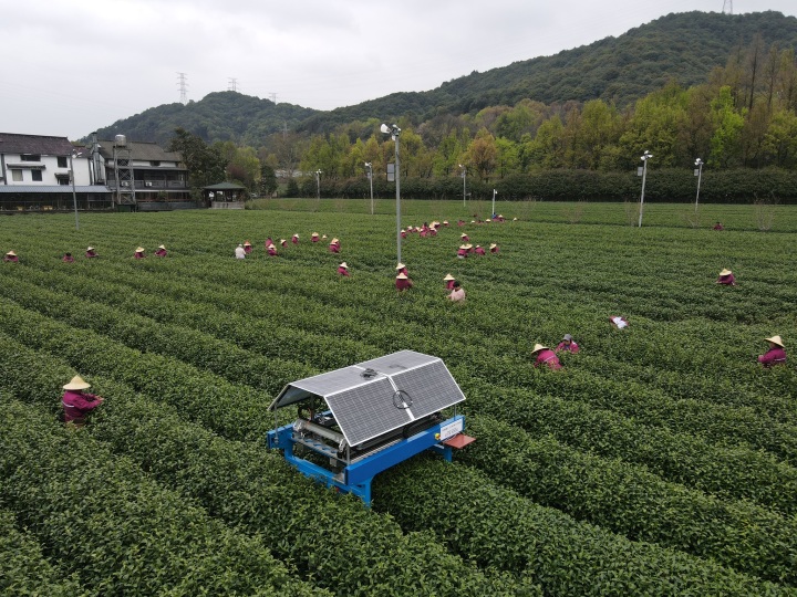 O rob? adota também a tecnologia de gera??o de energia fotovoltaica, a qual pode realizar a colheita ininterrupta de chá verde 24 horas por dia.