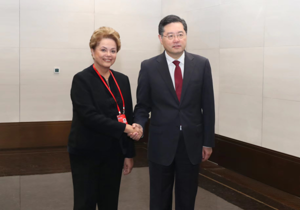 O conselheiro de Estado e ministro das Rela??es Exteriores da China, Qin Gang, reuniu-se com Dilma Rousseff, presidente do Novo Banco de Desenvolvimento (NBD), durante o Fórum Lanting sobre a Moderniza??o Chinesa e o Mundo na sexta-feira em Shanghai.