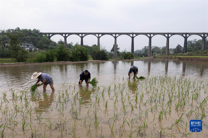 Durante a esta??o de plantio da primavera, no condado de Luxian, província de Sichuan, sudoeste da China, o canal de desvio de água através das colinas e das terras agrícolas, conhecido como "rio artificial do céu", vem desempenhando um papel importante para a irriga??o.