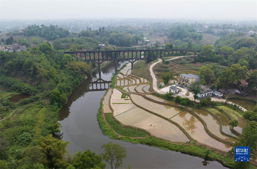 Durante a esta??o de plantio da primavera, no condado de Luxian, província de Sichuan, sudoeste da China, o canal de desvio de água através das colinas e das terras agrícolas, conhecido como "rio artificial do céu", vem desempenhando um papel importante para a irriga??o.