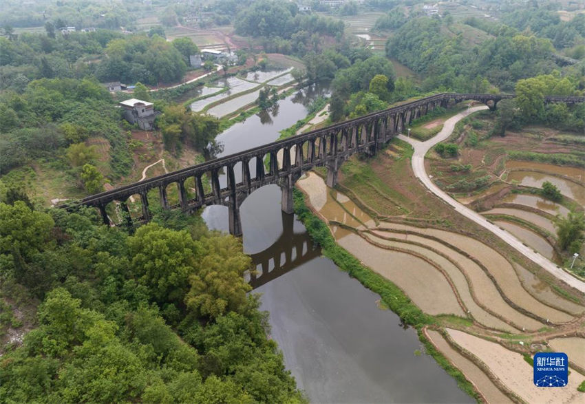 Durante a esta??o de plantio da primavera, no condado de Luxian, província de Sichuan, sudoeste da China, o canal de desvio de água através das colinas e das terras agrícolas, conhecido como "rio artificial do céu", vem desempenhando um papel importante para a irriga??o.