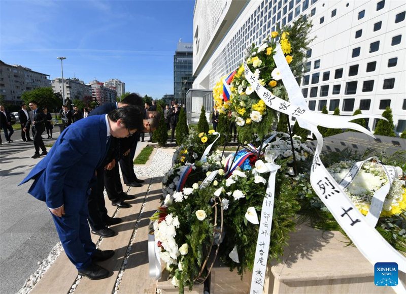 Representantes de empresas chinesas fazem uma vênia perante o monumento memorial no local da ex-embaixada chinesa bombardeada na República Federal da Iugoslávia em Belgrado, Sérvia, a 7 de maio de 2023. (Xinhua/Ren Pengfei)