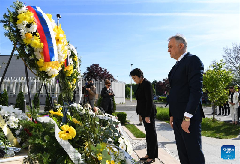 O ministro do Esporte da Sérvia, Zoran Gajic, e embaixadora da China na Sérvia, Chen Bo, defronte do monumento memorial no local da ex-embaixada chinesa bombardeada na República Federal da Iugoslávia em Belgrado, Sérvia, 7 de maio de 2023. (Xinhua/Ren Pengfei)