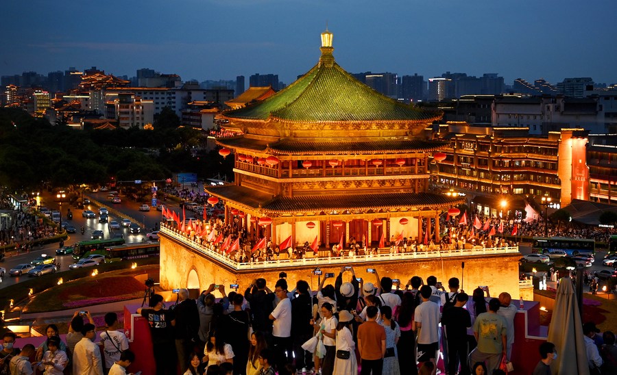 Turistas apreciam a vis?o noturna da antiga Torre do Sino em Xi'an, capital da província de Shaanxi, no noroeste da China, em 2 de maio de 2023. (Foto: Zou Jingyi/Xinhua)