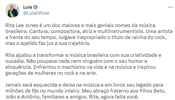 "Rita Lee Jones é um dos maiores e mais geniais nomes da música brasileira. Cantora, compositora, atriz e multi-instrumentista. Uma artista à frente do seu tempo. Julgava inapropriado o título de rainha do rock, mas o apelido faz jus a sua trajetória, disse o presidente brasileiro em seu perfil do Twitter.
