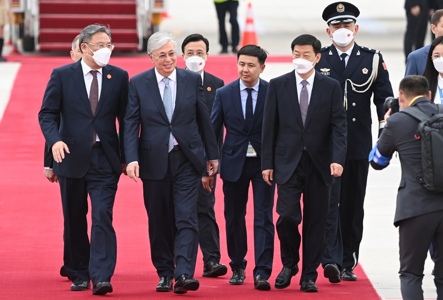 O presidente cazaque, Kassym-Jomart Tokayev, chega a Xi'an, província de Shaanxi, no noroeste da China, em 17 de maio de 2023. (Xinhua/Li Yibo)