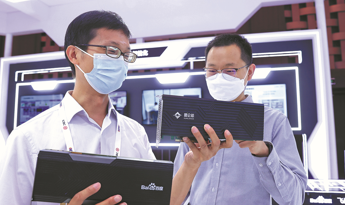 Visitantes observam os principais componentes dos modelos de funda??o de IA durante uma exposi??o em Beijing. Foto: Chen Xiaogen/China Daily