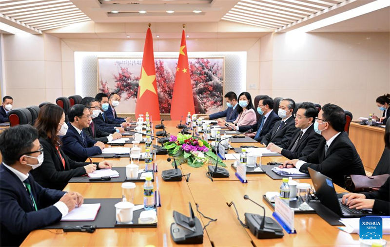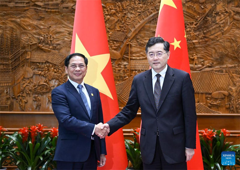 O conselheiro de Estado e ministro das Rela??es Exteriores da China, Qin Gang, reuniu-se no domingo em Beijing com o ministro das Rela??es Exteriores do Vietn?, Bui Thanh Son, que está acompanhando o primeiro-ministro vietnamita, Pham Minh Chinh, na sua visita à China.