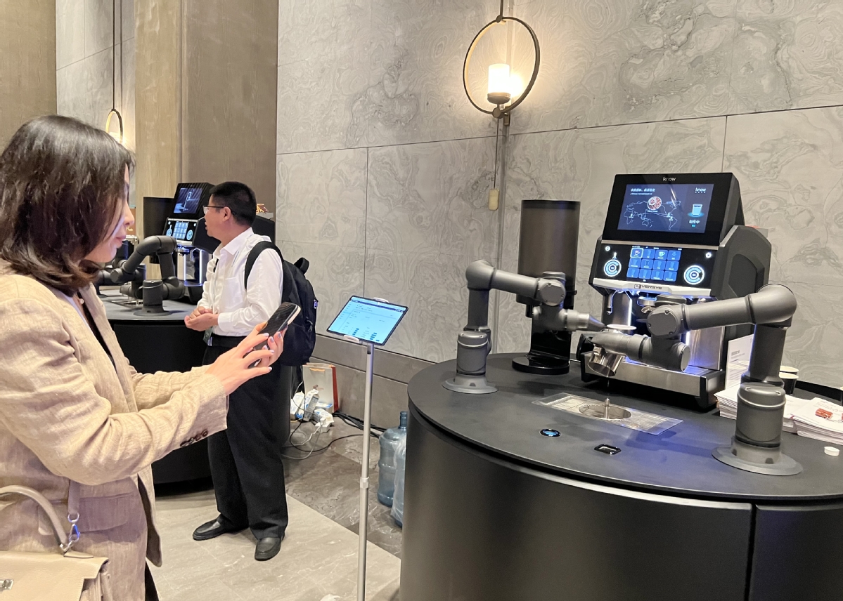 Um visitante tira uma foto de uma máquina de café automática em uma exposi??o realizada durante o Diálogo Nishan, da Conferência Mundial de Internet sobre a Civiliza??o Digital, em Qufu, província de Shandong, em 26 de junho de 2023. [Wang Qian, China Daily]