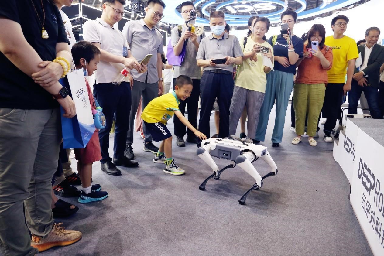 Crian?a interagindo com um c?o rob? no recinto da Conferência Mundial de Inteligência Artificial de 2023 em Shanghai, no dia 6 de julho. Foto de Chen Yuyu/Diário do Povo Online