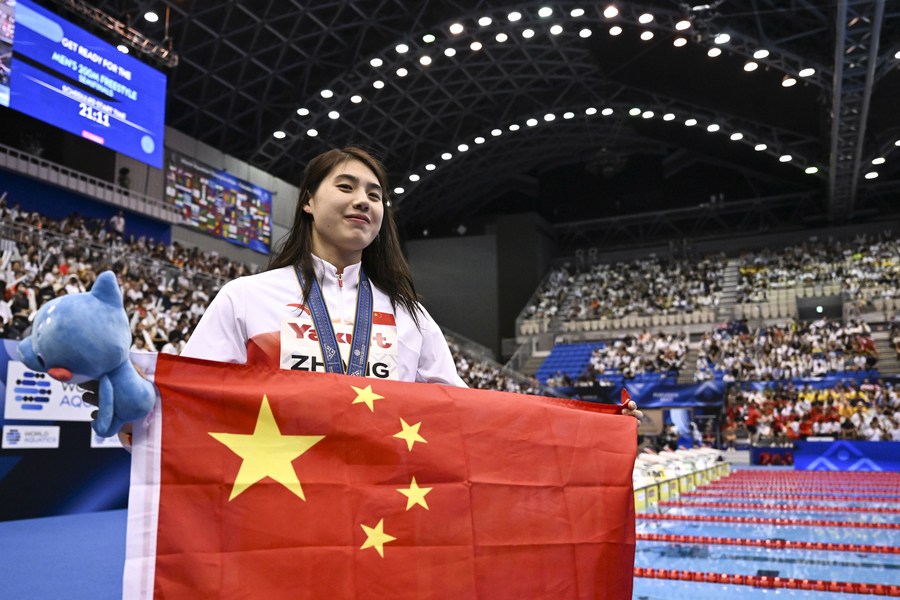 Zhang Yufei, após a cerim?nia de premia??o dos 100m borboleta feminino, no Campeonato Mundial de Esportes Aquáticos em Fukuoka, Jap?o, em 24 de julho de 2023. (Xinhua/Xu Chang)