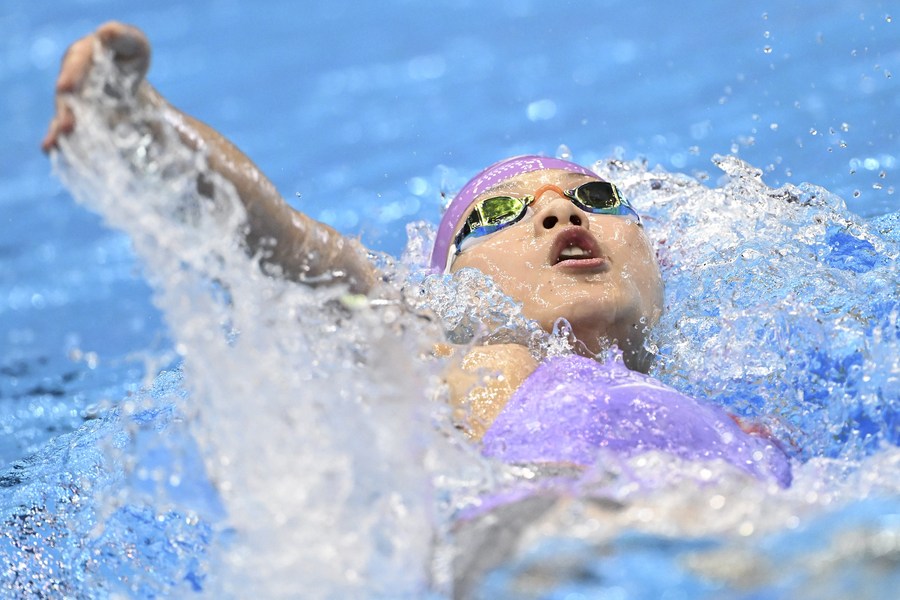 Yu Yiting, da China, em a??o durante a final dos 200m medley feminino no Campeonato Mundial de Esportes Aquáticos em Fukuoka, Jap?o, em 24 de julho de 2023. (Xinhua/Xu Chang)