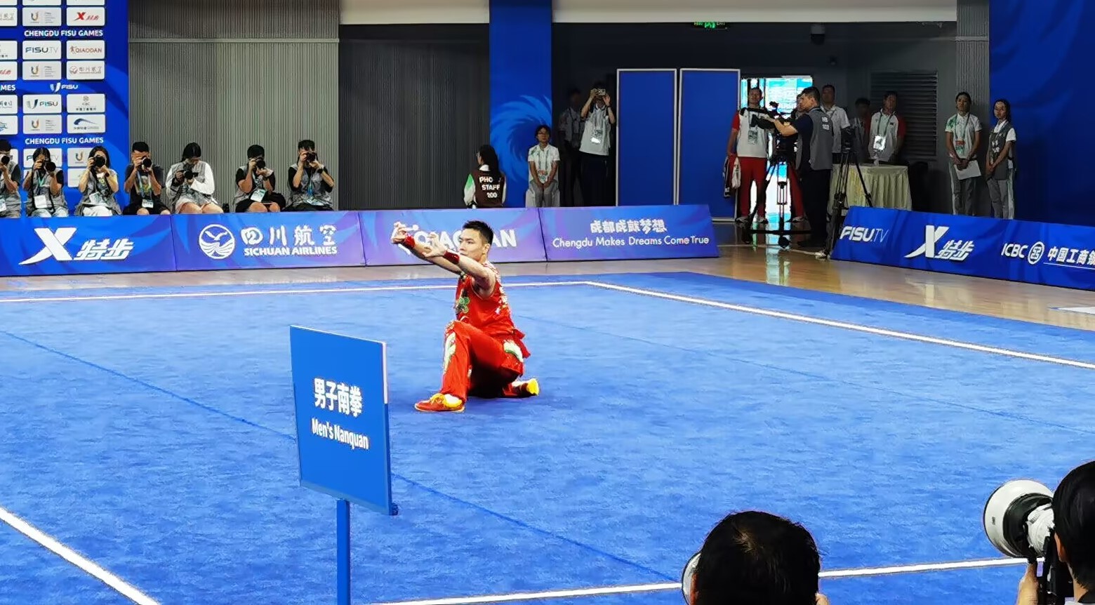 O chinês Cao Maoyuan conquistou a primeira medalha de ouro nos 31o Jogos Mundiais Universitários da FISU com a vitória no torneio masculino do estilo Nanquan de Wushu, realizado neste sábado.