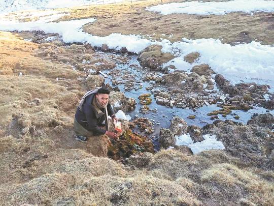 Gongba Karge coleta lixo plástico. Foto:China Daily