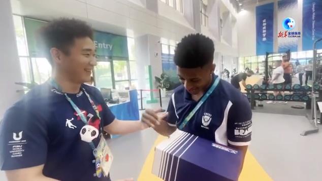 Quando Menezes abriu a caixa, ficou muito surpreso ao receber um par de tênis novinho do seu tamanho. O estudante-atleta brasileiro ficou emocionado e feliz em aceitar o presente e fazer um novo amigo chinês.