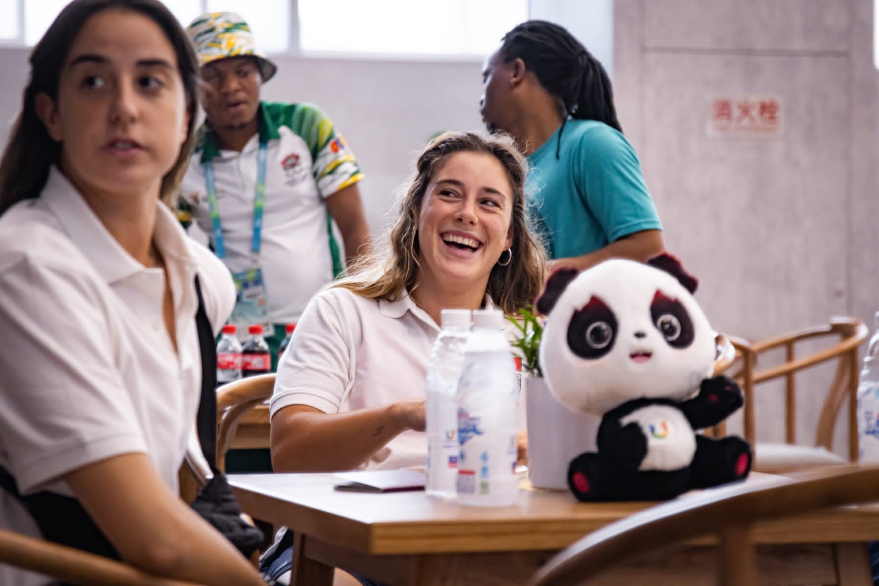 "Penso que um dos principais desafios é a adapta??o ao fuso horário. Nós vivemos num país que tem uma diferen?a de 7 horas e tivemos pouco tempo para nos adaptarmos ao horário da China. Só viemos 2 dias antes da competi??o e ent?o essa parte foi bastante desafiante, no que diz respeito a estar no nosso máximo fisicamente e mentalmente para iniciar a competi??o", afirmou a atleta.