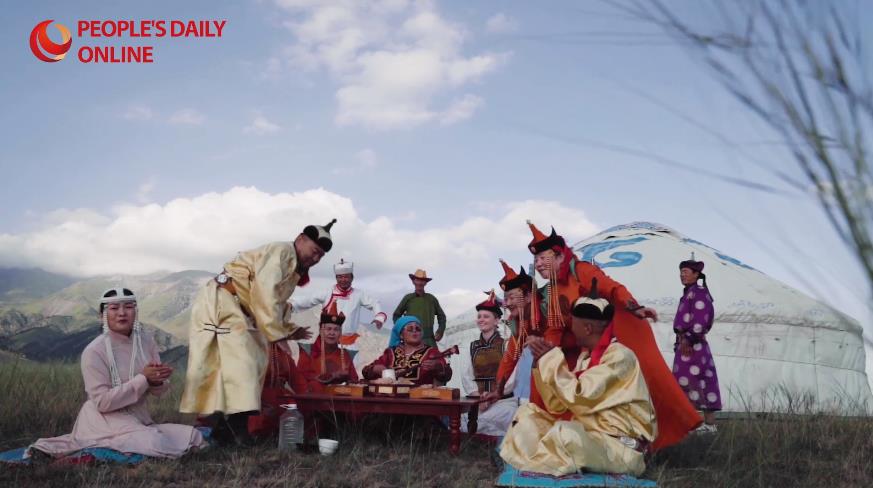 A turista russa Elena, trajada com roupa mogol, canta as can??es folclóricas locais e dan?a com Jiang Gu e os seus alunos na pastagem de Mierqike, condado de Wenquan, na Regi?o Aut?noma Uigur de Xinjiang, noroeste da China. Toda a gente mergulha na cultura das pastagens, vivenciando-a em primeira m?o.