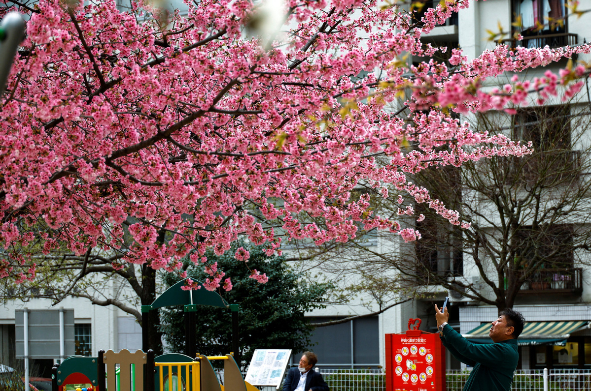 Um homem tira uma foto de flores de cerejeira em Tóquio, em 13 de mar?o de 2023. [Foto/Agências]