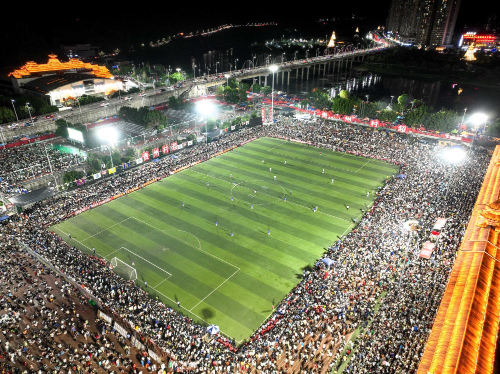 Plateia assiste a uma partida de futebol no condado de Rongjiang, província de Guizhou, no sudoeste da China, em 3 de junho de 2023. Fotos: VCG