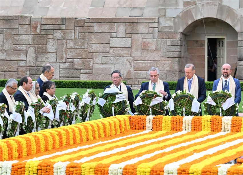 Na manh? de domingo, Li e outros líderes presentes na reuni?o ofereceram homenagens florais ao Memorial de Mahatma Gandhi.