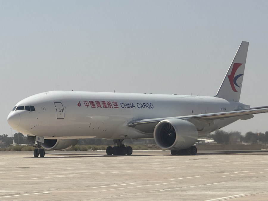 O avi?o de carga da China transportando suprimentos de ajuda urgente chega à cidade de Benghazi, no leste da Líbia, em 24 de setembro de 2023. (Foto: Ibrahim Hadia al-Majbri/Xinhua)