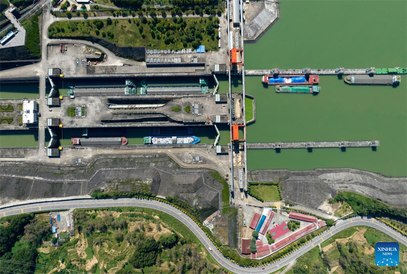 Navios atravessando as eclusas de cinco níveis da barragem das Três Gargantas, em Yichang, província de Hubei, no centro da China. (Foto de Wang Gang/Xinhua)