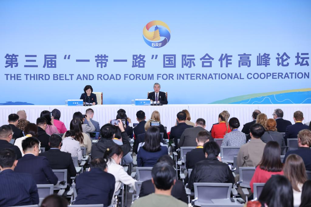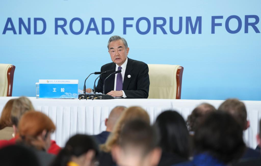 O ministro das Rela??es Exteriores da China, Wang Yi, também membro do Bir? Político do Comitê Central do Partido Comunista da China, participa de uma coletiva de imprensa do terceiro Fórum do Cintur?o e Rota para Coopera??o Internacional em Beijing, capital da China, em 18 de outubro de 2023. (Foto: Wang Yu Guo/Xinhua)
