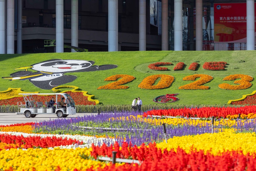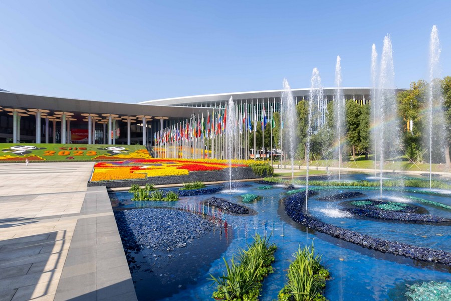 Pra?a sul do Centro Nacional de Exposi??es e Conven??es (Shanghai), principal local da 6a Exposi??o Internacional de Importa??o da China (CIIE), em Shanghai, leste da China, em 31 de outubro de 2023. (Wang Xiang/Xinhua)