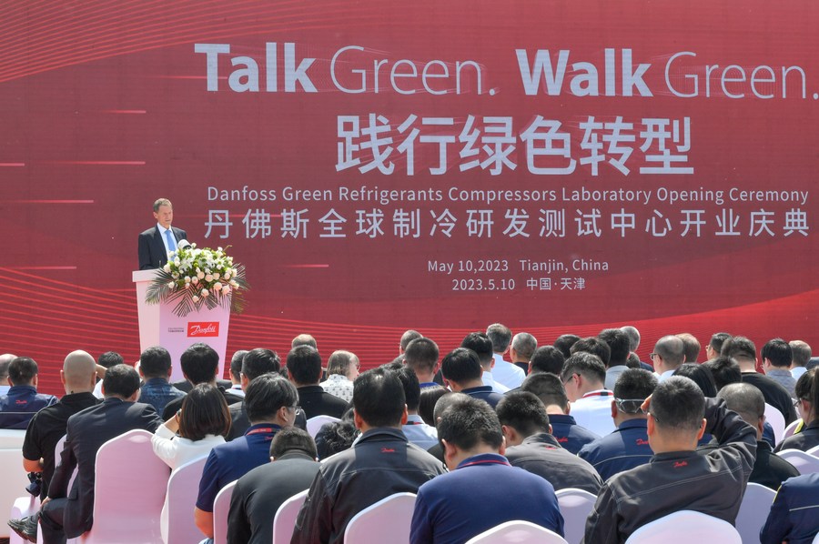 Kim Fausing, presidente e CEO do Grupo Danfoss, participa da cerim?nia de abertura do Laboratório Global de Compressores de Refrigerantes Verdes da Danfoss em Tianjin, norte da China, em 10 de maio de 2023. (Sun Fanyue/Xinhua)