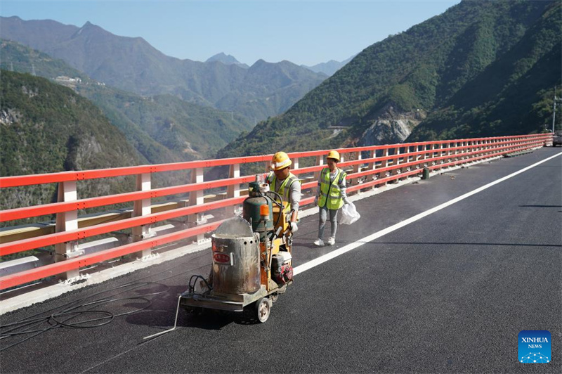 Trabalhadores no canteiro de obras da grande ponte Dongxihe na via expressa Wuxi-Zhenping, na província de Shaanxi, noroeste da China, em 1o de novembro de 2023. (Xinhua/Shao Rui)