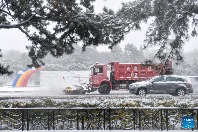 Um veículo de remo??o de neve limpa a neve de uma rua em Changchun, província de Liaoning, nordeste da China, em 6 de novembro de 2023. (Xinhua/Xu Chang)