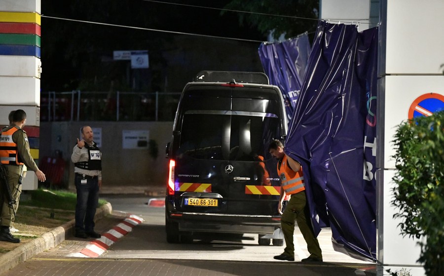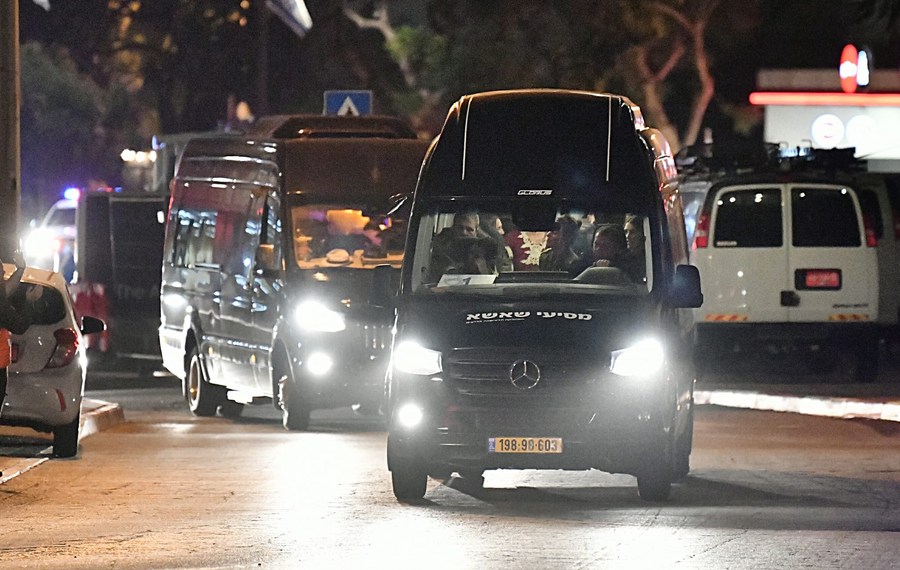 Um veículo transportando reféns libertados da Faixa de Gaza chega a um hospital em Ramat Gan, Israel, em 26 de novembro de 2023. (Foto: Jini/Xinhua)