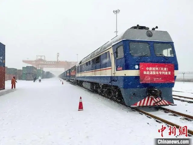 Este é o primeiro trem de carga China-Europa que parte de Tianjin exclusivamente para o transporte de NEVs fabricados na China, de acordo com as autoridades ferroviárias locais.