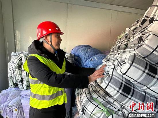 Um trabalhador transporta colchas para uma casa temporária recém-construída no condado de Jishishan, atingido pelo terremoto, província de Gansu, no noroeste da China, em 21 de dezembro de 2023. (Photo: China News Service)