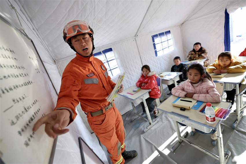 Bombeiros do Corpo de Bombeiros da Floresta de Gansu montaram e estrearam na quinta-feira (21) uma "escola de tenda" para as crian?as num local de realoca??o temporária na aldeia de Shiyuan, no condado de Jishishan, atingida por um terremoto, na província de Gansu.