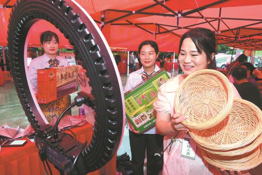 Uma apresentadora de transmiss?o ao vivo promove vendas de produtos com características locais durante uma exposi??o em Fuyang, província de Anhui. (Foto: Wang Biao/China Daily)