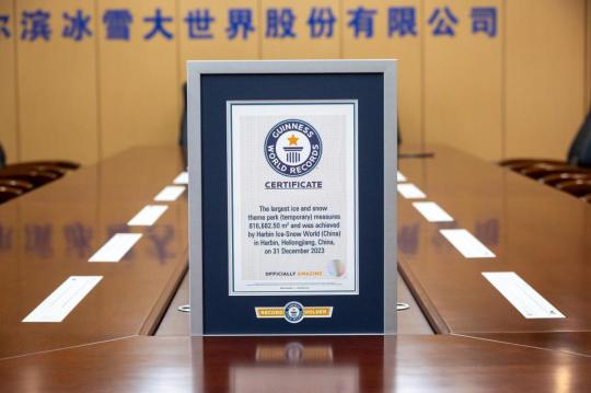 No Fórum de Desenvolvimento do Turismo de Gelo e Neve da China de 2024, realizado na sexta-feira (5) em Harbin, província de Heilongjiang, o Mundo de Gelo e Neve de Harbin foi reconhecido pelo Guinness World Records como o maior parque de gelo e neve do mundo, com uma área de 816.682,5 metros quadrados.