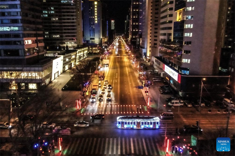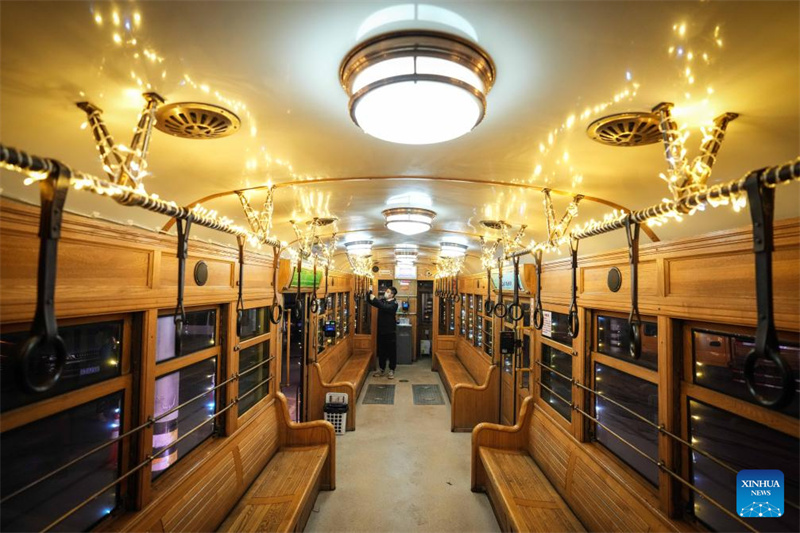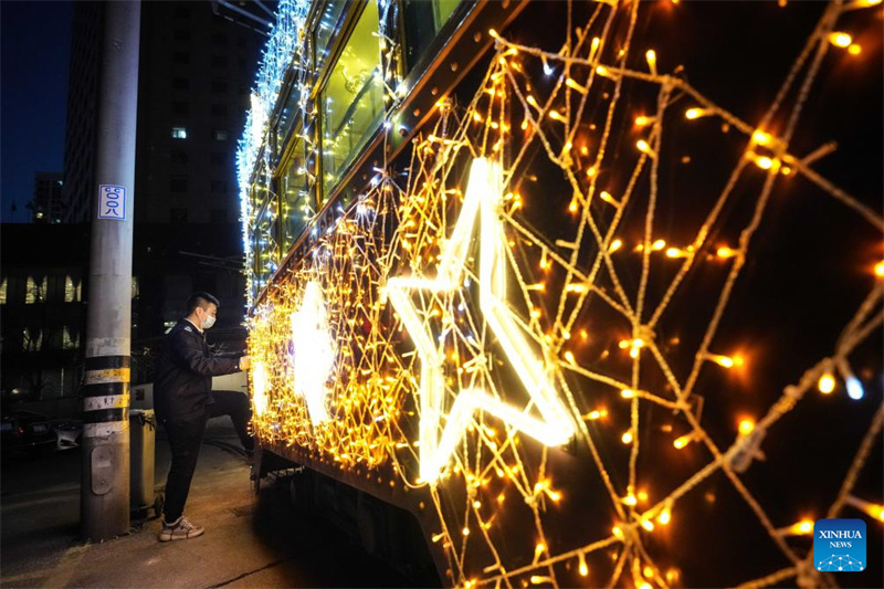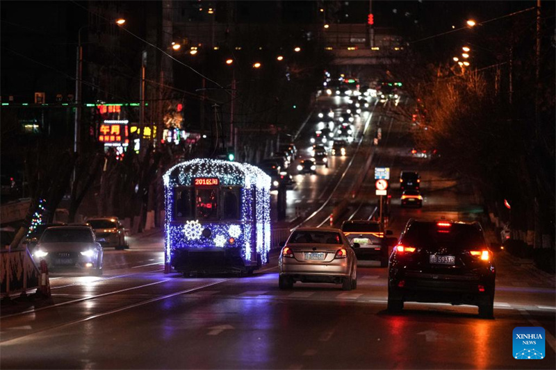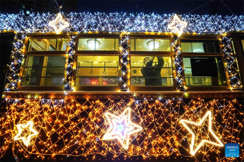 Um elétrico decorado com luzes é visto em Dalian, província de Liaoning, nordeste da China, em 9 de janeiro de 2024. Desde 31 de dezembro de 2023, vários elétricos em Dalian foram decorados com luzes para atrair mais turistas. A história do elétrico na cidade de Dalian remonta a 1909. Após mais de 100 anos de opera??o, o elétrico se tornou um ícone popular da cidade. Como a indústria do turismo em Dalian se recuperou desde 2023, muitos turistas vêm pegar os elétricos para apreciar a paisagem urbana. (Xinhua/Pan Yulong)