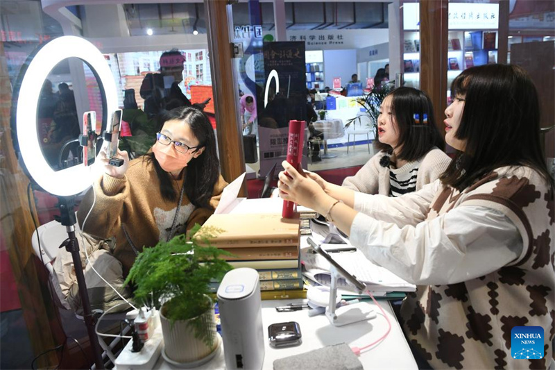 Um membro da equipe apresenta um livro via transmiss?o ao vivo na Feira do Livro de Beijing 2024, em Beijing, capital da China, em 11 de janeiro de 2024. (Xinhua/Ju Huanzong)