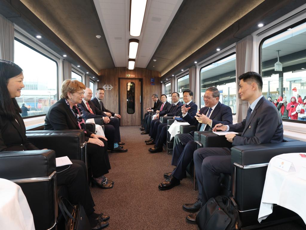 O primeiro-ministro chinês, Li Qiang, dialoga com a presidente da Confedera??o Suí?a, Viola Amherd, em uma atmosfera relaxante e amigável, em um trem especial de Zurique para Berna, capital da Suí?a, em 14 de janeiro de 2024. (Xinhua/Wang Ye)