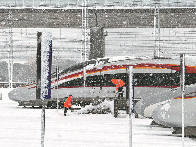 Trabalhadores removem neve e gelo de trens de alta velocidade em uma esta??o ferroviária em Nanchang, província de Jiangxi, na segunda-feira. (Foto: Xiao Yao, China Daily)