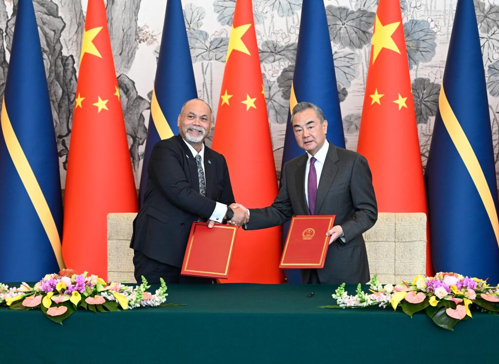 O ministro das Rela??es Exteriores chinês, Wang Yi, também membro do Bir? Político do Comitê Central do Partido Comunista da China, manteve conversa??es com o ministro das Rela??es Exteriores e Comércio de Nauru, Lionel Aingimea, na quarta-feira. Ambos assinaram um comunicado conjunto sobre a retomada das rela??es diplomáticas bilaterais em nível embaixador.
