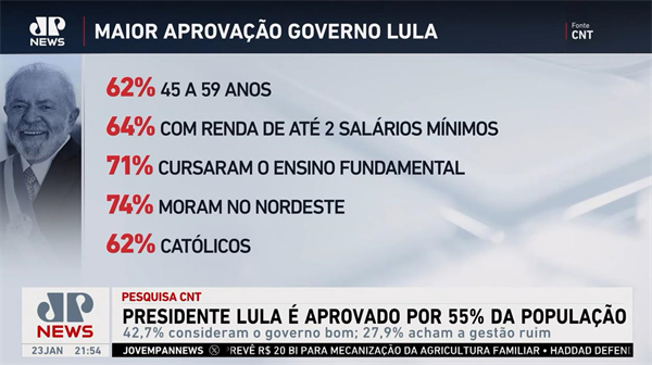 A pesquisa entrevistou 2.002 pessoas em 137 municípios de forma presencial entre 18 e 21 de janeiro. A margem de erro é de 2,2 pontos percentuais.