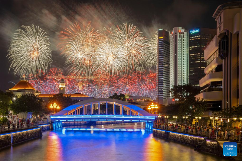 Fogos de artifício iluminam o céu sobre Marina Bay, em Singapura, 9 de agosto de 2023. (Foto de Then Chih Wey/Xinhua)