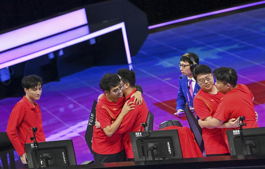 Membros da Equipe China comemoram após a final do DOTA2 de Esports nos 19o Jogos Asiáticos em Hangzhou, província de Zhejiang, leste da China, em 2 de outubro de 2023. (Foto: Yan Linyun/Xinhua)